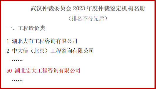根據(jù)武漢仲裁委員會(武漢國際仲裁中心)最新公布的《武漢仲裁委員會2023年仲裁鑒定機構(gòu)名冊》,湖北宏大工程咨詢有限公司(簡稱“湖北宏大”)入庫工程造價類,第50名。