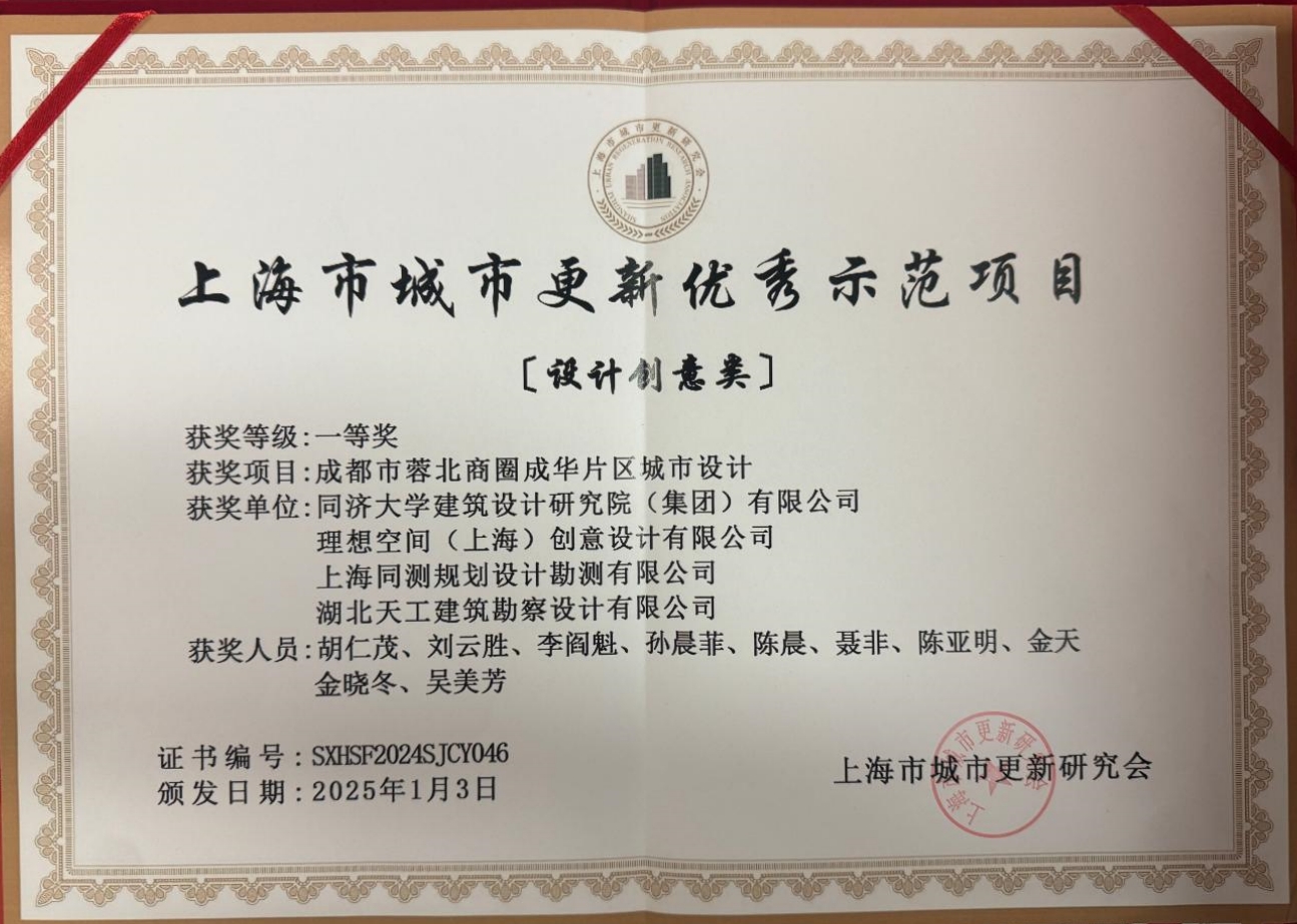 天工院聯(lián)合同濟(jì)大學(xué)建筑設(shè)計(jì)研究院(集團(tuán))有限公司、理想空間(上海)創(chuàng)意設(shè)計(jì)有限公司、上海同測規(guī)劃設(shè)計(jì)勘測有限公司設(shè)計(jì)的成都市蓉北商圈成華片區(qū)城市設(shè)計(jì)項(xiàng)目獲上海市城市更新優(yōu)秀示范項(xiàng)目(設(shè)計(jì)創(chuàng)意類)一等獎(jiǎng)。